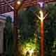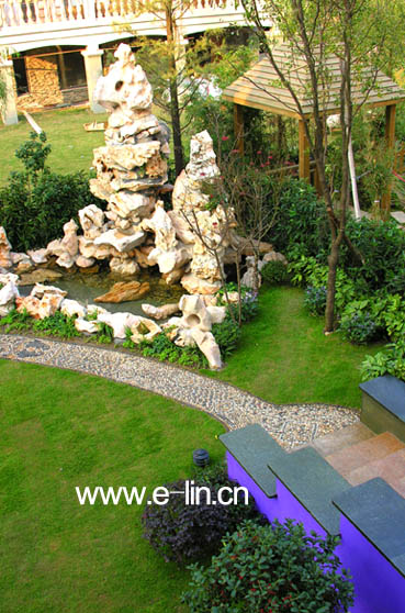 设计面积: 400平米 工程周期: 100天 硬件设施: 德国GARDENA自动定时喷灌系统 波兰AQUAEL水池生态过滤系统 UV杀菌除藻系统 LED低功率照明系统 设计思路: 该花园分为南面蔬果园与北面山水内庭两部分,通过侧面 的玫瑰拱门与楼梯进行空间的分区与过渡.紫色背景墙的 设计与瘦漏的太湖石形成鲜明的对比,更有"紫气东来"的 美好寓意.花园中采用高<壁灯>中<射灯>低<草坪灯>多层 空间的灯光设计,力求营造温馨绚丽的夜色景观.